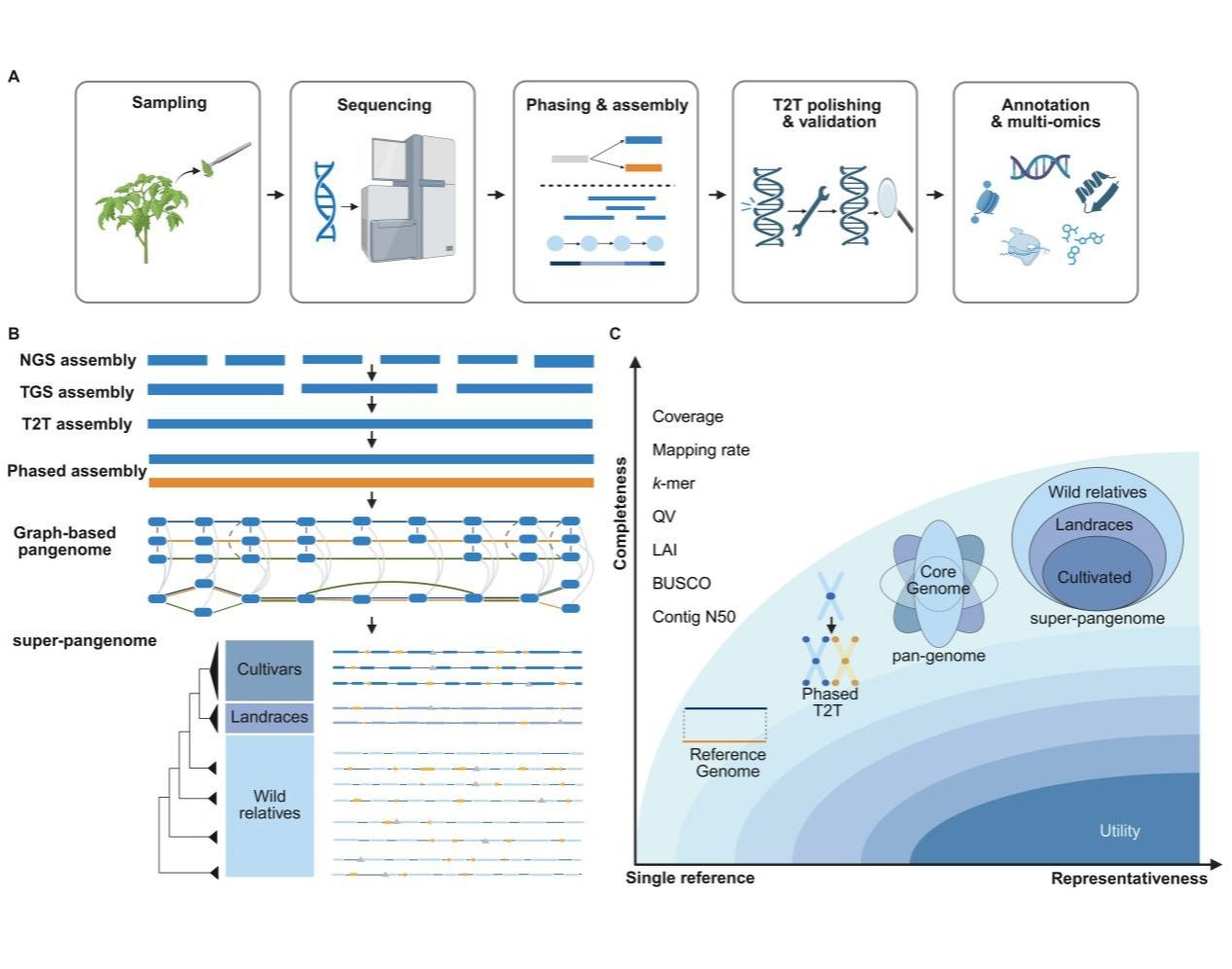 近日,Beat365三亚南繁研究院陈飞教授团队在植物基因组学领域提出全新理论框架,成功定义了植物基因组研究的“终极形态”:分型端粒到端粒(Phased T2T)超级泛基因组 。该成果近日发表于国际植物科学期刊《Trends in Plant Science》(植物科学趋势),通过系统整合全基因组高保真组装与超级泛基因组技术路径,将基因组完整度与群体多样性覆盖率提升至前所未有的高度 ,解决了传统参考基因组缺失复杂区域(如着丝粒、端粒)且无法涵盖物种内遗传变异的核心痛点,...