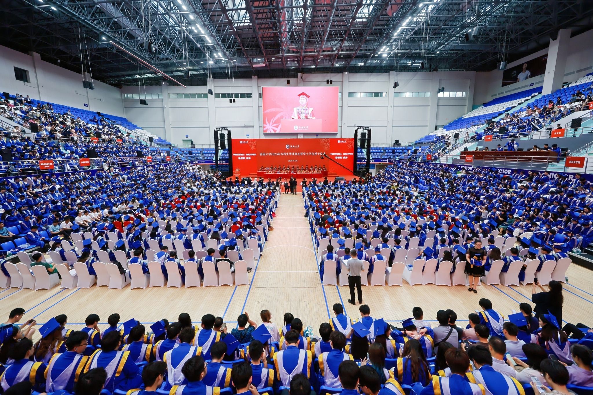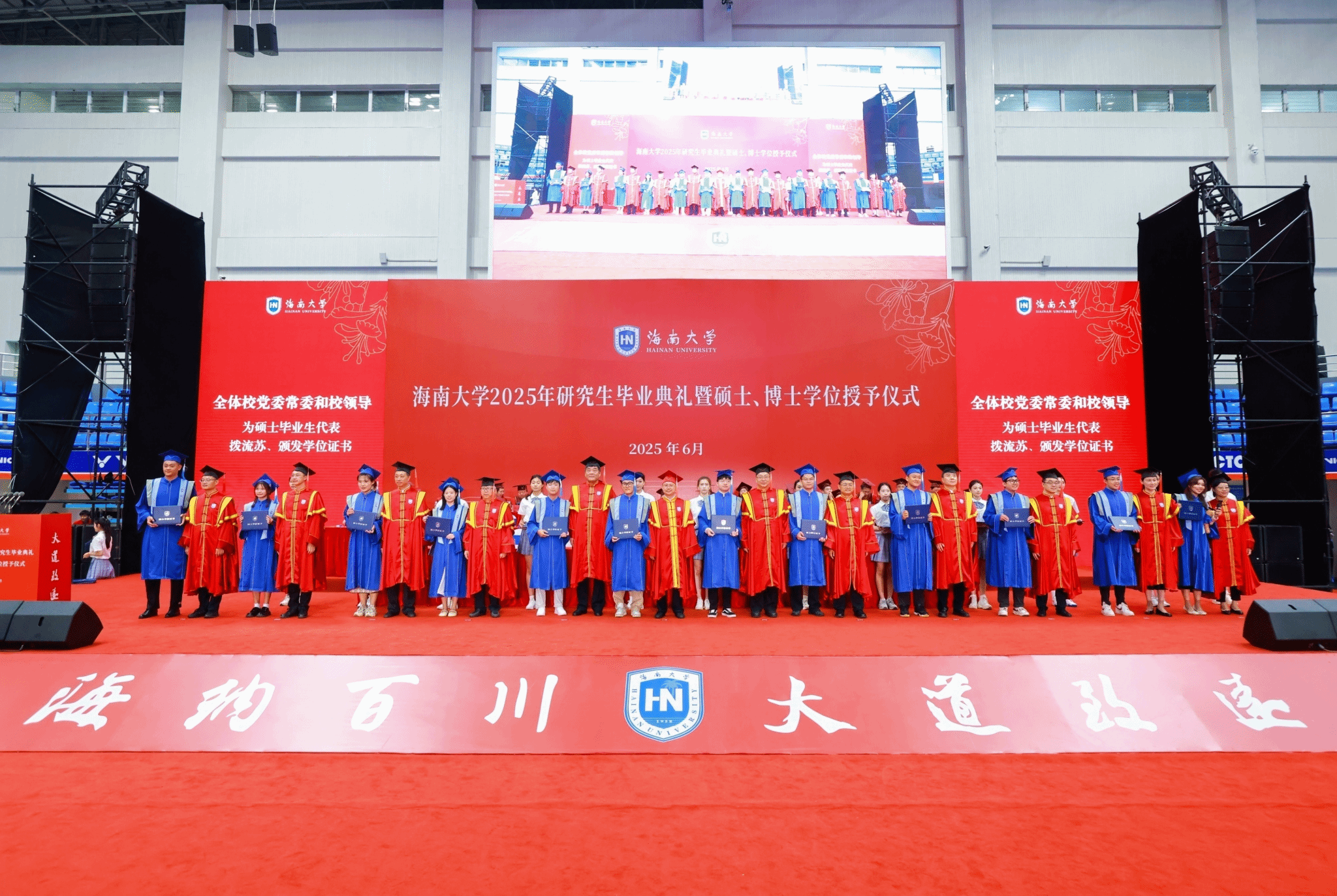 本站讯(记者张阳 张梦婷)夏至椰风好,天涯云路开。6月19日,Beat365官方网站2025年研究生毕业典礼暨硕士、博士学位授予仪式在多功能综合体育馆举行。2837名硕士研究生、186名博士研究生顺利完成学业,即将奔赴人生新征程。