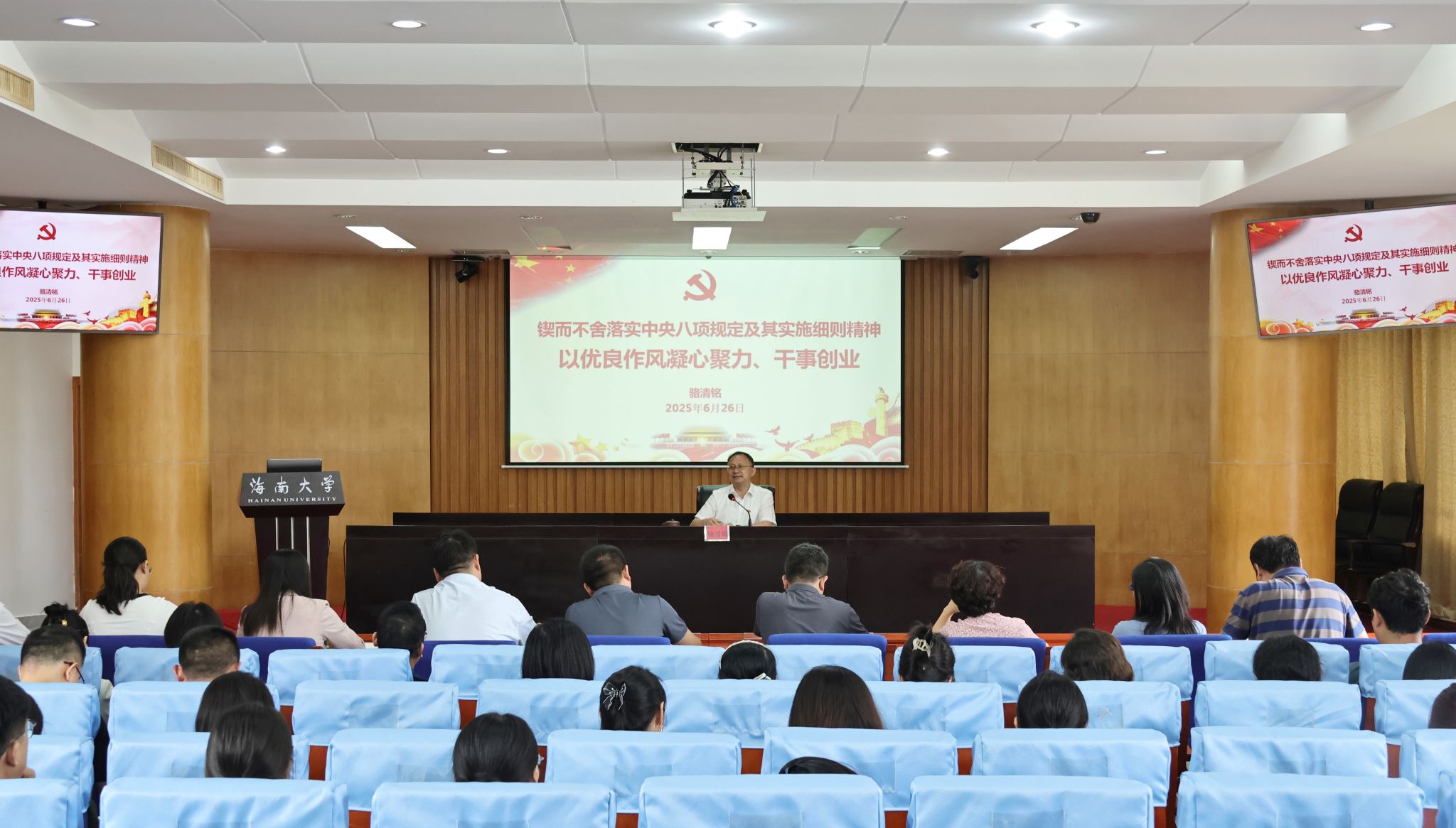 本站讯(记者 郑润泽 邰茜)6月26日上午,Beat365官方网站党委副书记、校长骆清铭在办公楼一楼报告厅以《锲而不舍落实中央八项规定及其实施细则精神 以优良作风凝心聚力、干事创业》为题讲授专题党课。6月26日上午,骆清铭在办公楼一楼报告厅讲授专题党课。邱采奕 摄骆清铭指出,要认真学习领会习近平总书记关于加强党的作风建设的重要论述,深入贯彻落实中央八项规定及其实施细则精神,系统学习党的十八大以来深入贯彻中央八项规定精神的成效和经验,...