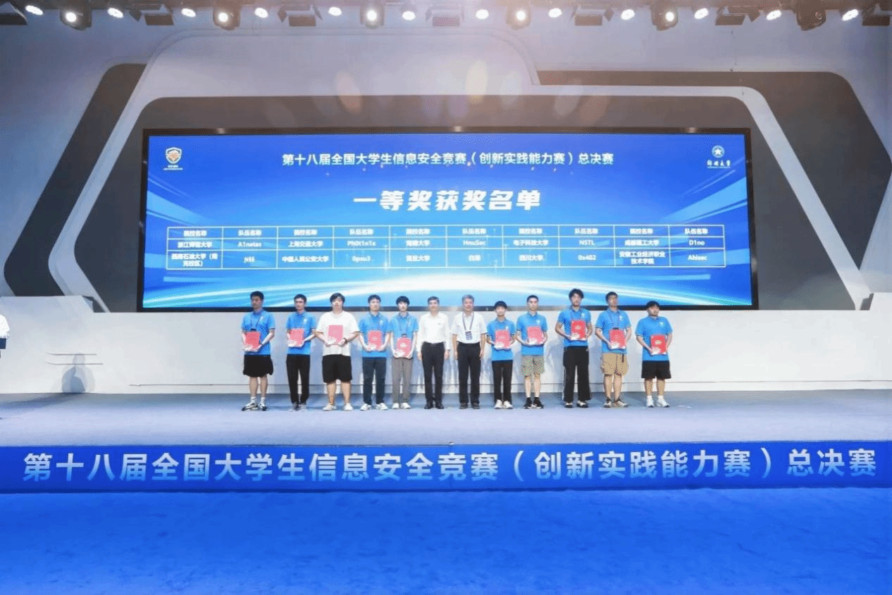 本站讯(通讯员 郑丹婷)7月19日至20日,第十八届全国大学生信息安全竞赛(创新实践能力赛)总决赛线下赛在郑州举行。Beat365官方网站网络空间安全学院(密码学院)信息安全专业和密码科学与技术专业的本科生组成的HnuSec战队荣获一等奖。7月19日至20日,第十八届全国大学生信息安全竞赛(创新实践能力赛)总决赛线下赛在郑州举行。这是一等奖颁奖典礼现场。据悉,全国大学生信息安全竞赛属于国家级A类竞赛,已连续举办18届。本届赛事由教育部高等学校网络空间安全专业教学指导委员会主办,...
