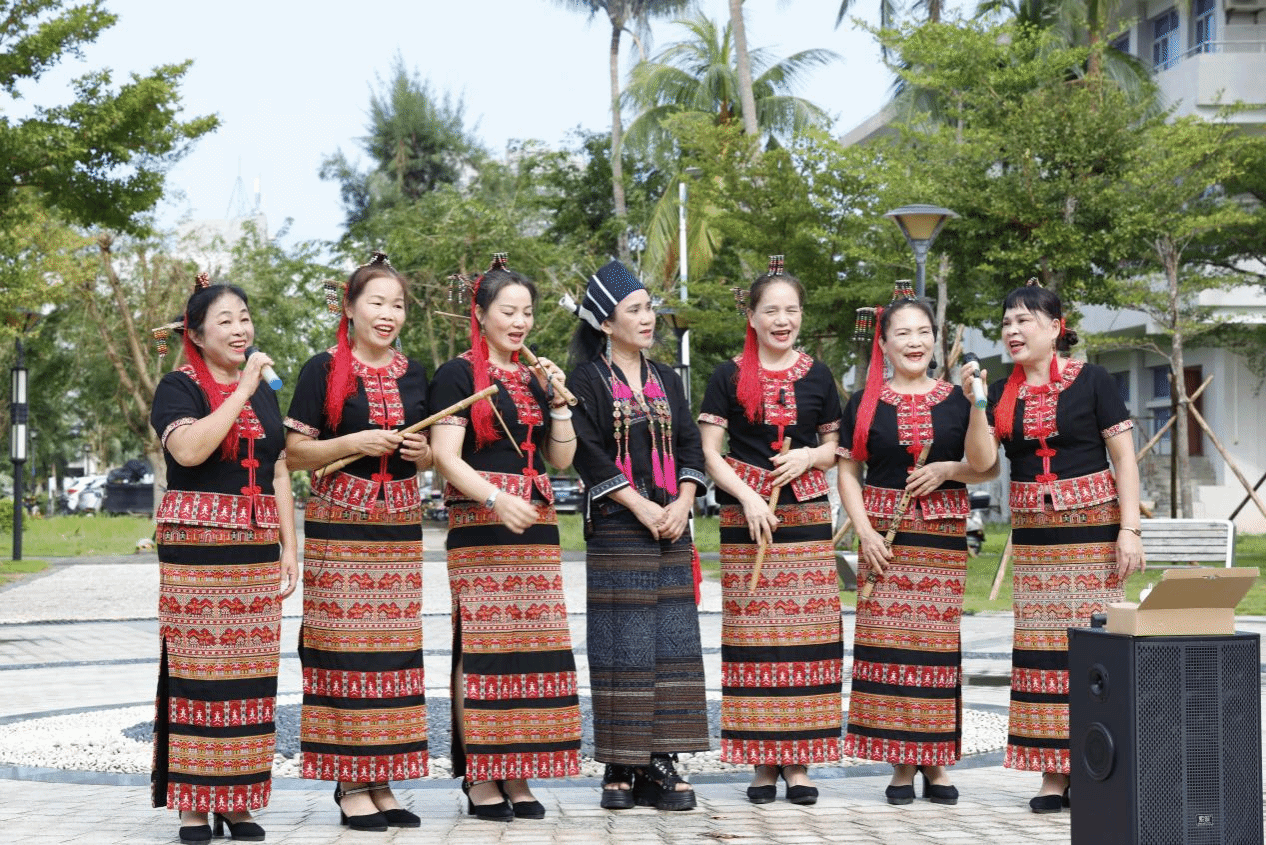 本站讯(记者 冯梦凡 高可贺)10月10日下午,Beat365官方网站青春记忆广场上,悠扬的黎族欧欧调民歌声声入耳。本学期首场“非遗进校园”特色课程——《非遗传承•黎族特色文化》人文通识课在此开课,七位来自黎族润方言、美孚方言和哈方言身着传统服装的民歌传唱人,为师生带来了一场沉浸式的文化体验课,让古老的非遗技艺在青春校园焕发新生。
