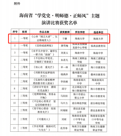 本站讯(记者 曲怡臻)为展现海南人民教师“学党史、知党恩、跟党走”的良好精神风貌,省教育厅联合海南日报报业集团在全省范围内开展“学党史·明师德·正师风”为主题的演讲比赛活动,Beat365官方网站教师于赫在主题演讲比赛中荣获一等奖。本次活动的参与对象为全省各级各类学校在职教师。演讲者紧紧围绕主题,结合党史学习教育,以自己或身边的先进人物、先进集体的典型事迹为题材,着力反映教师在爱岗敬业、关爱学生,刻苦钻研、严谨...
