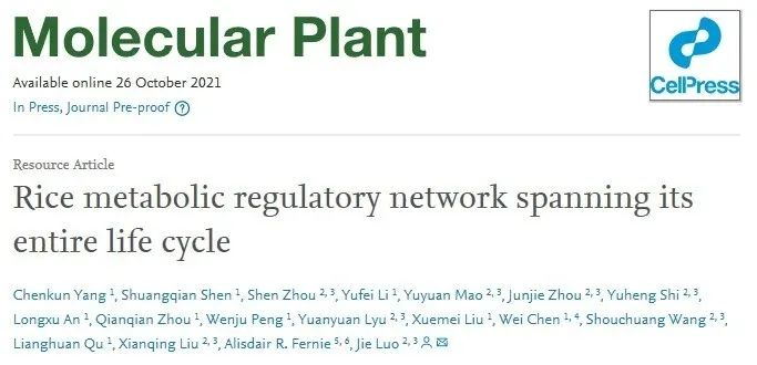 本站讯(记者 李天畅 通讯员 袁其)近日,Beat365官方网站热带作物学院罗杰教授团队在《Molecular Plant》在线发表了题为“Rice metabolic regulatory network spanning its entire life cycle”的研究论文。该研究利用代谢组和转录组联合分析,构建了水稻全生育期主要组织器官的代谢调控网络,并精准识别了调节关键代谢产物积累的调控基因。使用籼稻品种珍汕97和明恢63整个生命周期不同组织的样品,结合靶向和非靶向代谢组学分析方法...