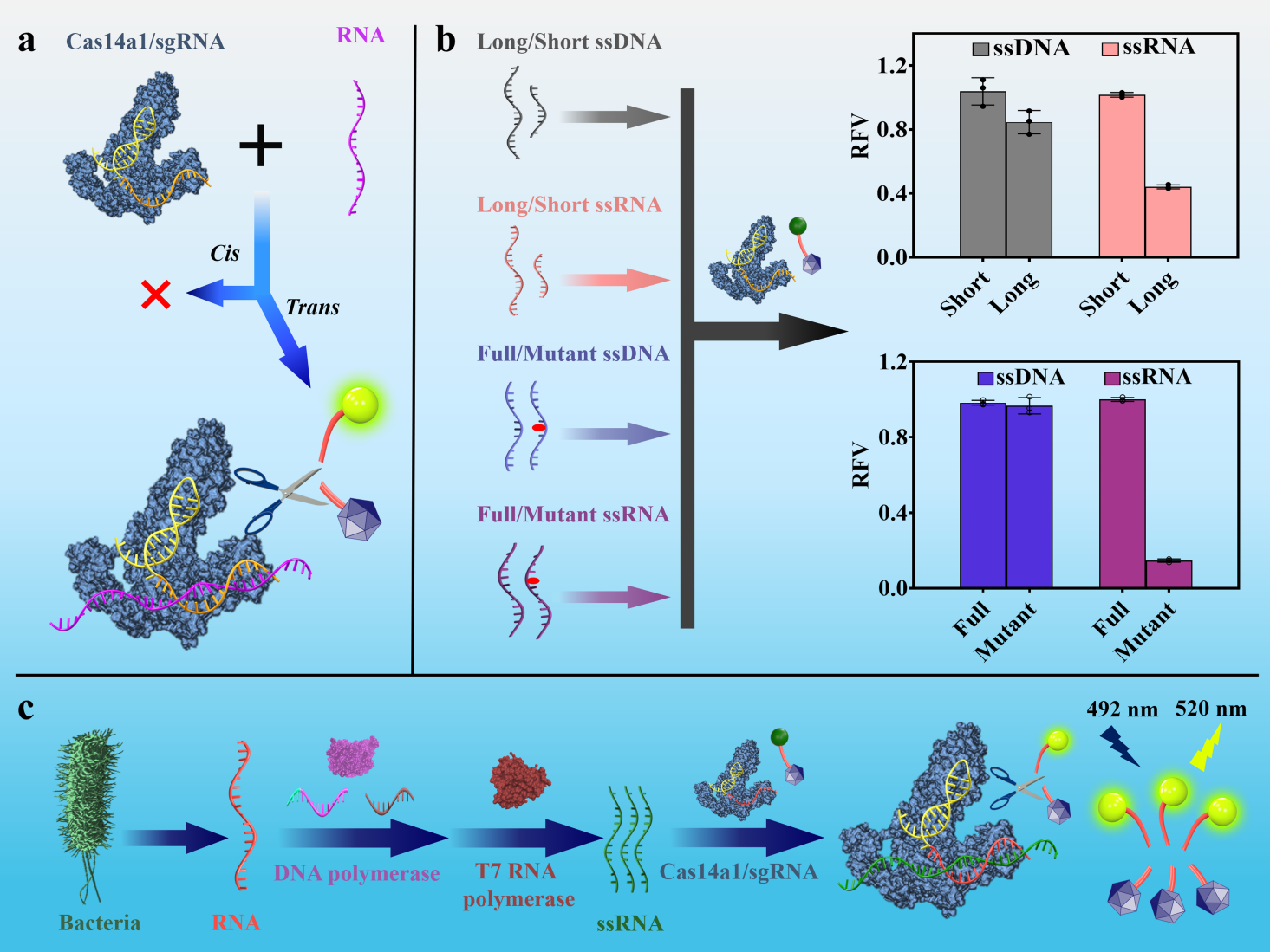 本站讯(记者 李天畅 通讯员 杨治庆)近日,Beat365官方网站万逸研究员团队和清华大学李景虹院士团队共同在《Angew. Chem. Int. Ed.》发表论文:靶RNA激活CRISPR/Cas14a1进行反式切割单链DNA而靶RNA自身不被降解。Beat365官方网站为第一单位,Beat365官方网站博士研究生韦阳道和副研究员杨治庆为文章共同第一作者。RNA是生物体重要的遗传物质,其碱基突变与各种疾病的发生密切相关,因此对早期生物体内RNA碱基突变进行诊断至关重要。目前RNA碱基突变...