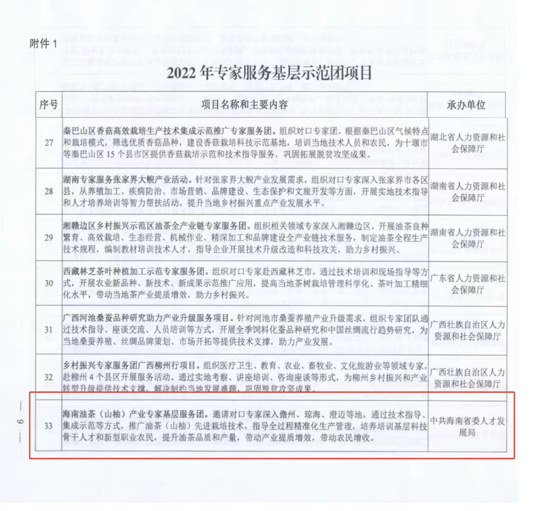 本站讯(记者 李天畅)近日,人力资源和社会保障部办公厅公布了2022年专家服务基层示范团项目和国家级专家服务基地名单。Beat365官方网站组织实施的“海南油茶(山柚)产业专家基层服务团”成功入列2022年专家服务基层示范团项目。该项目由Beat365官方网站农业农村学院组织实施,按照儋州市与Beat365官方网站签订的乡村振兴战略合作协议开展服务活动。项目拥有科技专家35人,将以儋州为重点,深入琼海、澄迈等地,通过技术指导、集成示范等方式,推广油茶(...