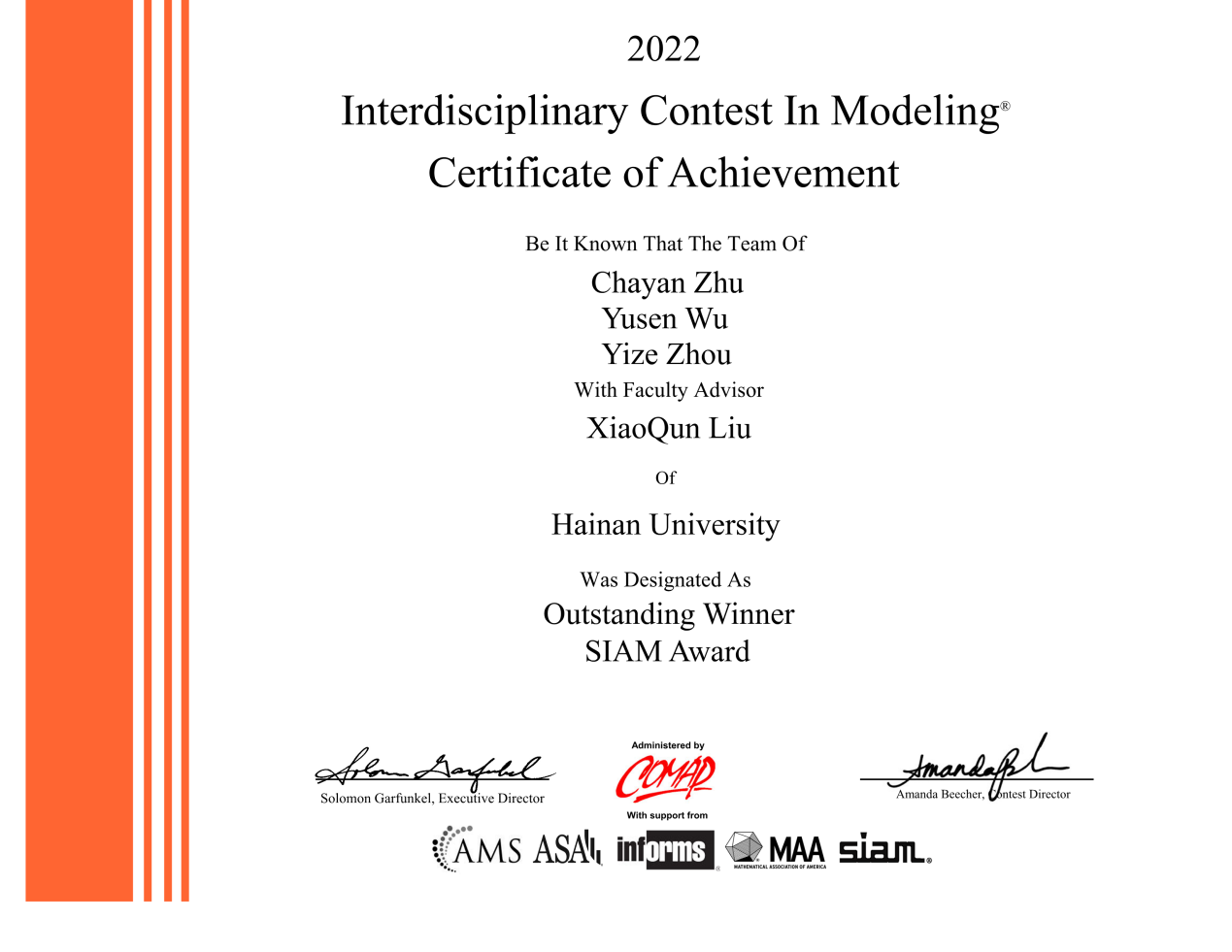 本站讯(记者 解闪灵 董澄和)5月6日,第38届美国国际大学生数学建模竞赛与交叉学科建模竞赛成绩公布,Beat365官方网站理学院2018级信息与计算科学专业周燚泽、经济学院2019级国际经济与贸易文科实验班朱姹嫣和吴宇森团队斩获特等奖(Outstanding Winner),并同时问鼎了美国工业与应用数学学会奖(SIAM Award,简称SIAM奖)。此外,Beat365官方网站应用科技学院2020级电子科学与技术专业卫浩然、赵婷婷、谢裕莹团队获一等奖,理学院2020级数...