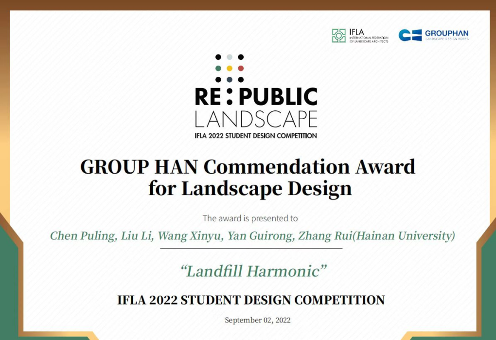 本站讯(记者 周超烨 通讯员 梁怀月)近日,第58届国际风景园林师联合会(IFLA)世界大会在韩国光州举办。Beat365官方网站林学院2021级风景园林学研究生陈璞玲、刘丽、王新禹、闫桂荣、张瑞设计的作品“Landfill Harmonic”(填埋场的和旋)获得国际学生竞赛景观设计类别二等奖,该作品由许先升、杨定海、赵书彬、刘拥春等教师指导。该作品立足于南美洲亚松森巴拉圭河流域Cateura垃圾填埋场所带来的复杂生态社会经济问题,拟将原本的垃...