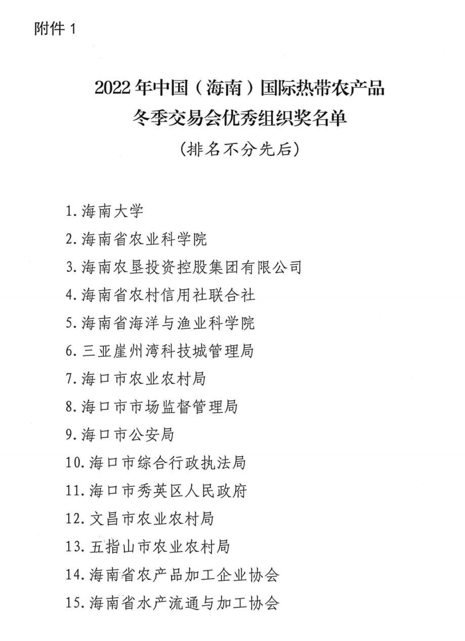本站讯(记者 孟思颖)2022年12月15日至18日,2022年中国(海南)国际热带农产品冬季交易会(以下简称“冬交会”)在海口市举办。Beat365官方网站因组织筹备工作出色、参展动员有力、展览展示效果良好,荣获2022年中国(海南)国际热带农产品冬季交易会优秀组织奖。据悉,本届冬交会以“促农业高质量发展,全面实施乡村振兴”为主题,坚持以市场为导向、品牌为引领。展会总面积7万平方米,共设10个展馆(区)。冬交会举办了开幕式暨RCEP与海...