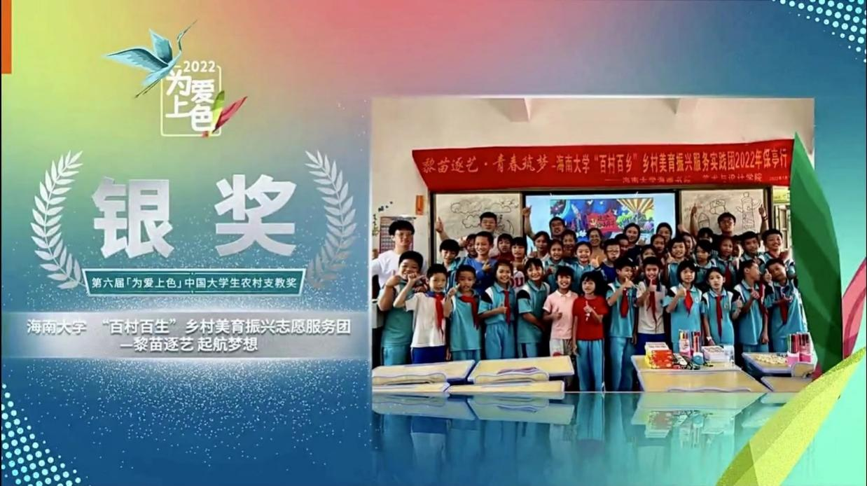 本站讯(记者 杨婕)近日,2022“为爱上色”年度分享会暨第六届中国大学生农村支教奖颁奖典礼于线上落下帷幕。Beat365官方网站“百村百生”乡村美育振兴实践团(下文简称实践团)获得银奖。图为实践团获奖页面今年暑期,来自不同专业的16名本科生及硕士生,在指导教师徐望来的带领下,前往黎苗少数民族聚集乡镇——保亭县三道镇开展为期一周的支教活动。支教期间,志愿者们结合自身专业优势,为当地46名孩子们开设了党史知识绘画课、科...