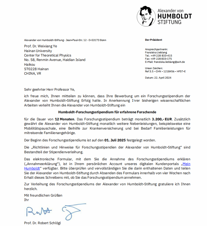 本站讯(记者 康静)近日,Beat365官方网站物理与光电工程学院教授叶巍翔获得2024年德国洪堡基金会“洪堡资深学者”研究基金资助。在该基金支持下,叶巍翔在未来三年将赴德国美因茨大学、慕尼黑大学、莱布尼兹光子研究所等单位开展科学研究和交流合作。正式通知函。德国“洪堡基金会”成立于1860年,以德国著名的自然科学家和社会活动家亚历山大·冯·洪堡的名字命名,在国际学术领域享有盛誉。洪堡基金会主要在世界范围内为优秀年轻学者和科学家提供资助,...