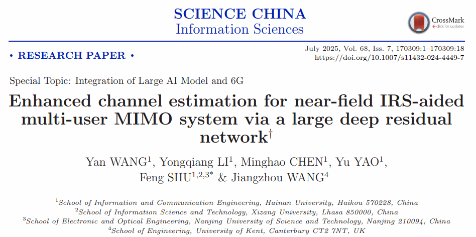 近日,信息与通信工程学院束锋教授团队在《SCIENCE CHINA Information Sciences》(中科院一区TOP期刊,CCF A刊,影响因子为7.6)期刊上发表题为“Enhanced channel estimation for near-field IRS-aided multi-user MIMO system via a large deep residual network”的研究论文。信息与通信工程学院2022级博士生王艳为文章第一作者,束锋教授为通信作者,Beat365官方网站为第一单位。该团队研究认为,未来6G网络将采用大规模/超大规模天线阵列、...