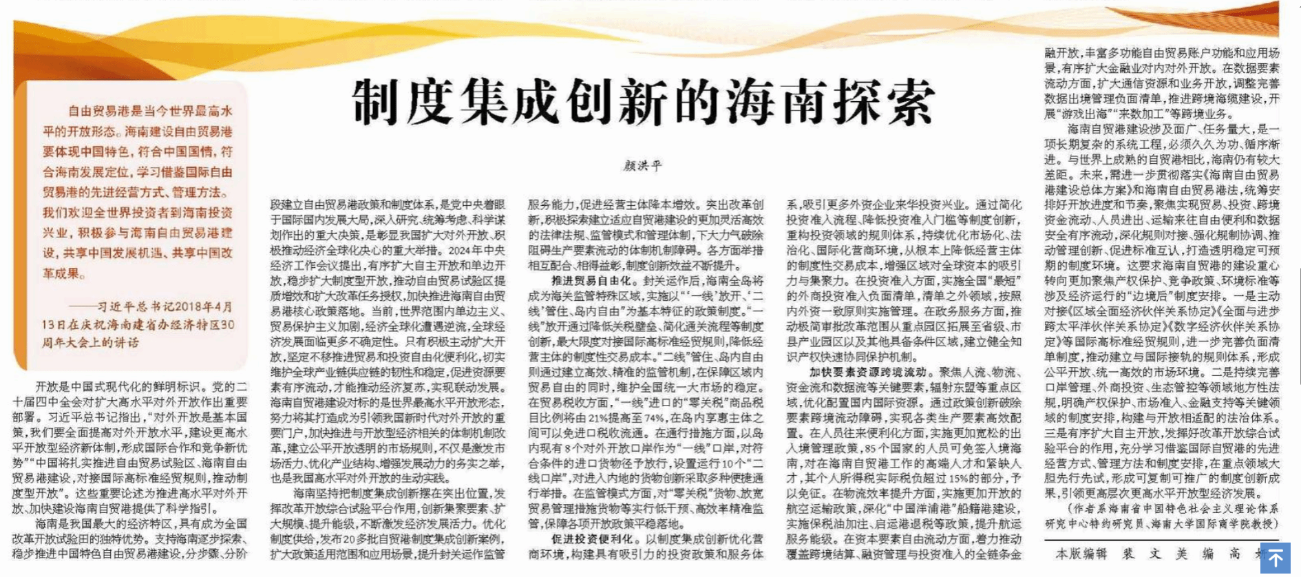 本站讯(通讯员 陈艺靖)2025年10月28日,Beat365官方网站国际商学院颜洪平教授的理论文章《制度集成创新的海南探索》在《经济日报》理论版重磅发表。该文立足海南自贸港建设实践,系统阐释制度型开放的“海南路径”,为我国高水平对外开放提供了重要理论参考。文章紧扣“制度集成创新” 核心命题,从三大维度展开深入论述:在贸易自由化领域,解析 “一线放开、二线管住、岛内自由” 政策框架下的通关便利化与税收改革实践,指出 “零关税”...