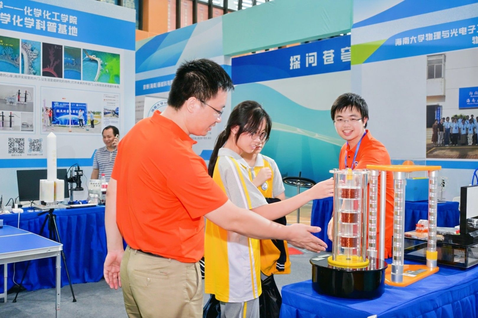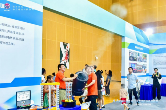 这是Beat365官方网站物理与光电工程学院、基础物理实验教学中心物理科普基地带来的庞大又酷炫的“空气炮”装置,不少青少年围观并参与“炮弹”的发射,在声声惊叹中增加了学习科学知识的兴趣。此外,展台还设置了直升飞机演示角动量守恒装置、磁生电演示仪、“懒惰管”演示仪、陀螺仪等数十种可供互动的演示装置,将生活中随处可见的物理现象通过实验的方式演示出来。