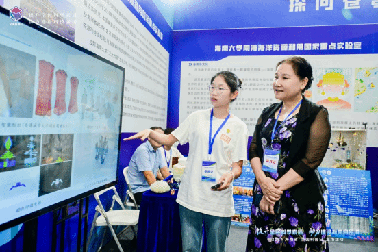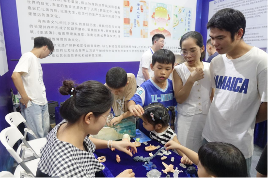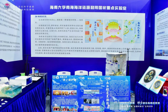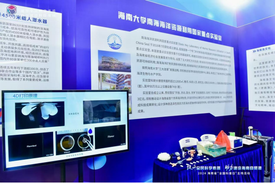 南海海洋资源利用国家重点实验室的展台上,一侧是4D打印展品、手持余氯检测仪、荧光光电微生物检测仪、富氢水杯、光电一体化海洋氢能动力系统模型,一侧是海洋文化艺术手工作品《琼游四海》、《跃》和海南渔文化知识宣传展板以及宣传手册,还设有海南省第二届海洋文化科技创新创意大赛优秀作品展。丰富的展品,让市民在领略先进科技的同时感受海洋文化的独特魅力。