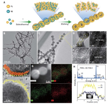 ▶ 研发了一种用于燃料电池的具有铂壳层结构的、一维束状铂镍合金纳米笼催化剂,该催化剂的质量活性和比活性达到3.52 A mgPt-1 and 5.16 mA cmPt-2,是目前商业铂催化剂的15倍以上。