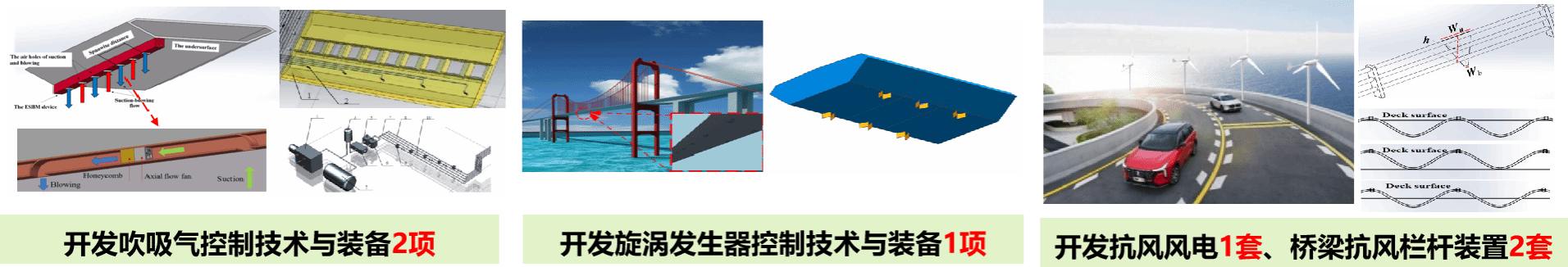 以提高大跨桥梁、大跨空间结构、超高层建筑与高耸结构、海洋与海岛设施等的抗风能力,保障重大工程安全为目标,经过产学研一体化联合攻关,提出了结构风振抑制的吹/吸控制技术、旋涡发生器控制技术、抗风风电以及抗风栏杆控制技术,并开发了一系列的相关设备与装置。