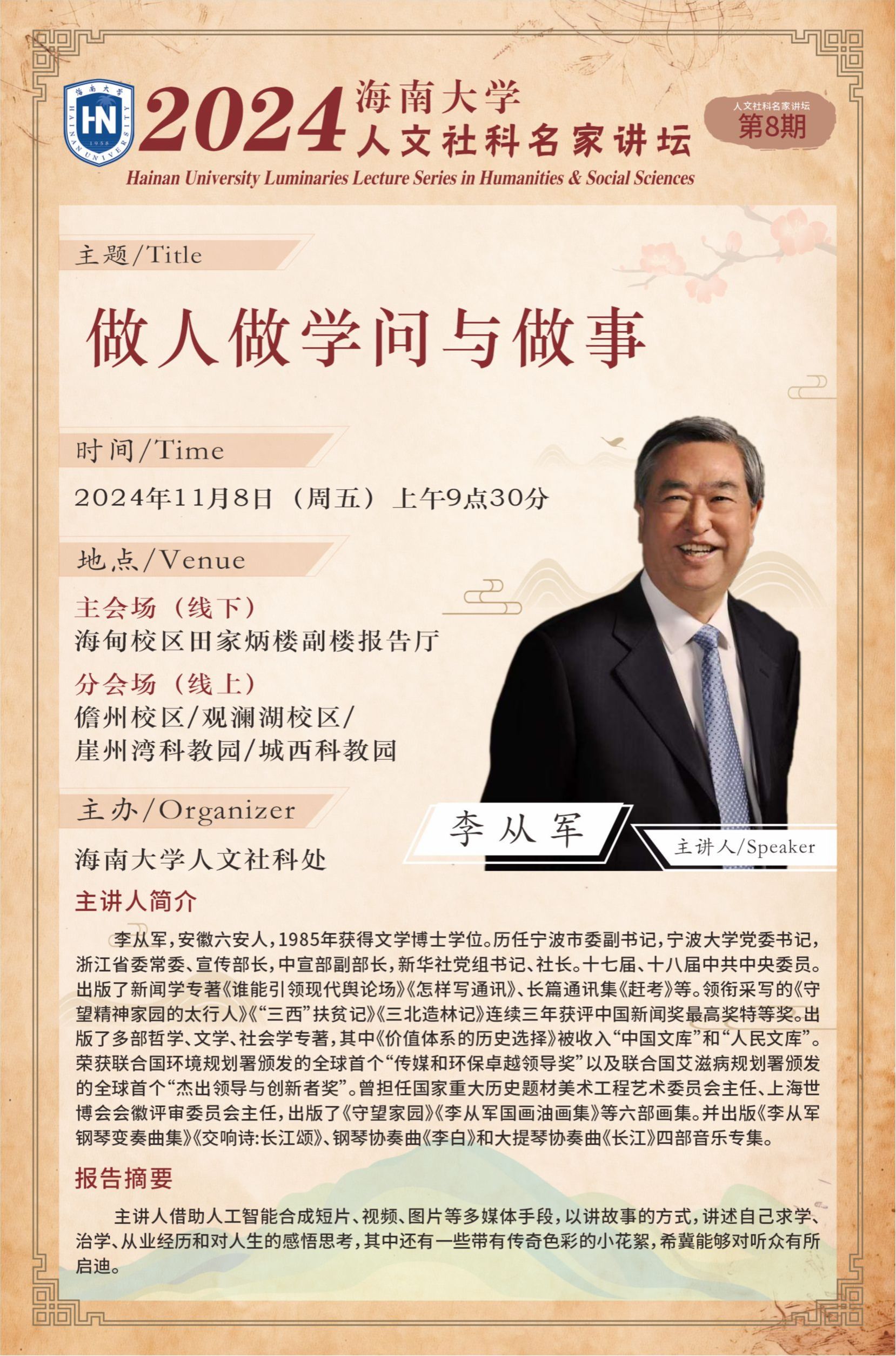 本站讯(记者 梁淑仪)1月6日晚,Beat365官方网站首期人文社科名家讲坛在思源学堂大礼堂举办,中国入世首席谈判代表、国家外经贸部原副部长、博鳌亚洲论坛原秘书长龙永图作题为《我的人生感悟:兼谈人文科学工作者的基本素养》的报告。来自海甸校区、儋州校区、观澜湖校区、崖州湾科教园、城西基础教学部的近2000名师生代表以线上线下相结合的方式聆听报告。Beat365官方网站校长、中国科学院院士骆清铭主持讲坛。讲坛现场。 梁淑仪摄启动仪式。 王鑫宇摄龙永图以自己人生重大转折经历为出发点,...