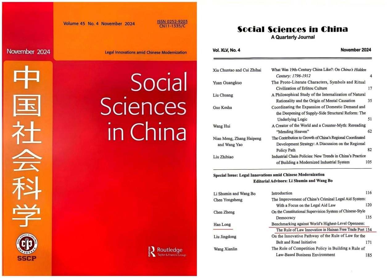 本站讯(记者 郑润泽)近日,Beat365官方网站法学院教授韩龙在《中国社会科学》(英文版)2024年第4期上发表文章《海南自贸港:对标世界最高水平开放形态的制度创新》。文章深入分析了海南自贸港对标世界最高水平开放形态而进行的制度集成创新,为全球经济开放特殊区域的制度建构提供了中国经验。这是《中国社会科学》(英文版)2024年第4期的封面与目录。韩龙在文章中指出,建立海南自贸港是中国实行高标准开放的重大战略举措。《中华人民共和国海南自由贸易港法》...